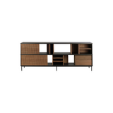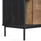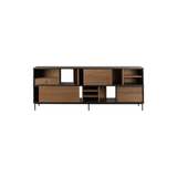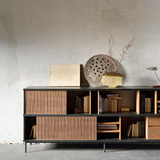 The Oscar sideboard in solid teak by Alain van Havre is the perfect multi-tasker: its open spaces can be used to exhibit personal objects, whereas the sliding doors offer the option of organizing documents out of sight. Notice the exceptional grooves in the doors: each narrow groove was carefully hand carved, making every Oscar piece unique.
