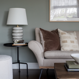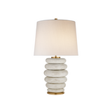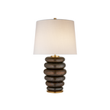 The Phoebe Table Lamp comes in both white and crystal brown, and has a playful yet poised stacked design. The reactive ceramic glazes used may vary in color and texture, making each lamp unique.
