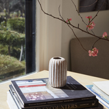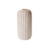 Earth tones created by a reactive glaze give the Fault Line Vase a unique, gourd-like surface appearance, while vertical, textured lines and color variation add interest to the simplicity of the cylindrical shape. Layer into shelf decor or add fresh stems in the small opening for a pop of color and dimension.